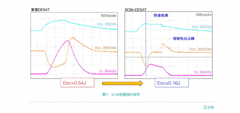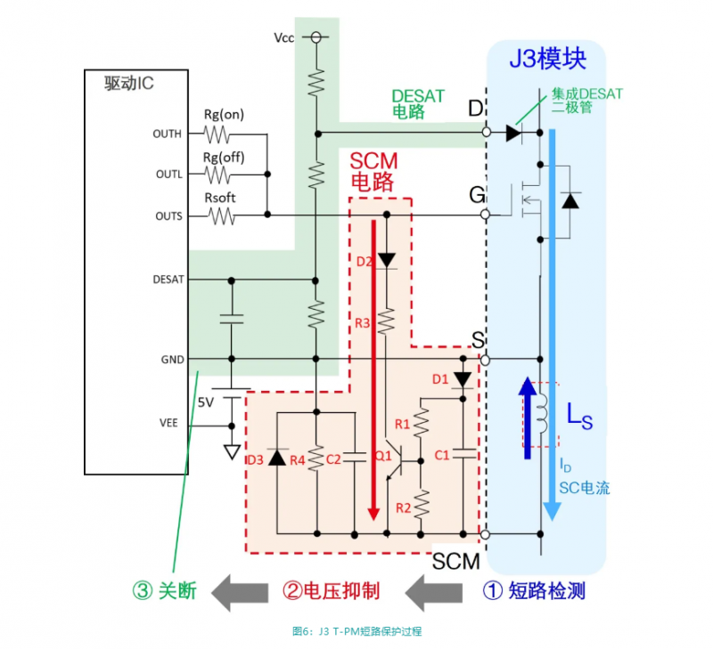 由于SiC芯片面积小,与Si芯片对比,更易发生短路破坏。在短路时,需要比Si产品更快速地切断电流。J3系列产品配备了短路检测管脚(SCM),通过检测主回路的di/dt,来控制栅极电压(图6)。使用SCM功能可以抑制短路电流,减小短路能量,如图7所示。该技术使得用户能够更容易进行短路保护。此外,J3系列T-PM内部集成了DESAT二极管,用户不需要在驱动板上额外安装DESAT二极管,可以帮助客户节约布线空间,缩小驱动板尺寸。