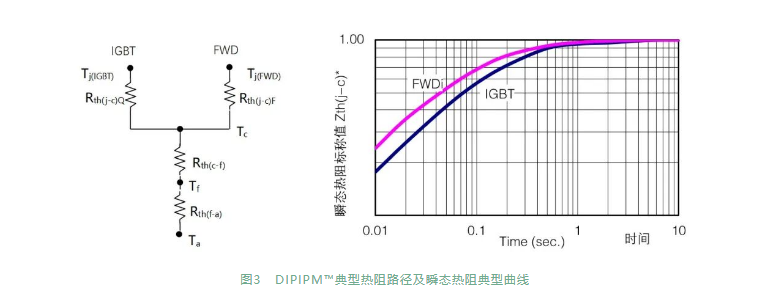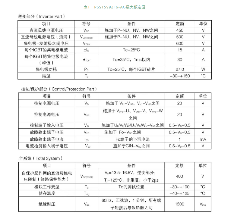 Ic为DIPIPM™内部IGBT芯片集电极在Tc=25℃时所能允许流过的直流电流最大值。IGBT作为开关器件,实际流过的是脉冲电流,工作时周期性的开通和关断必然带来开关损耗,从而导致内部功率芯片的结温变高。在实际工作中,模块工作电流一般小于规格书中Ic。合适的工作电流值既要保证DIPIPM™关断时刻的电压值在安全工作区内,也要保证内置功率芯片的结温在安全范围内(≤Tjmax)。
