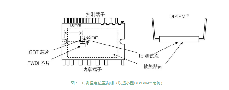被定义为指定功率芯片正下方的温度,将温度传感器放在散热面的指定位置上可以测得准确的温度信息,如图2所示,不同型号产品请查看各自规格书,Tc测试点一般设定在模块VN-IGBT的正下方。当采用不同的控制策略时,Tc最高温度点可能不在上述位置,此时有必要将测量点调整到温度最高的功率芯片正下方。