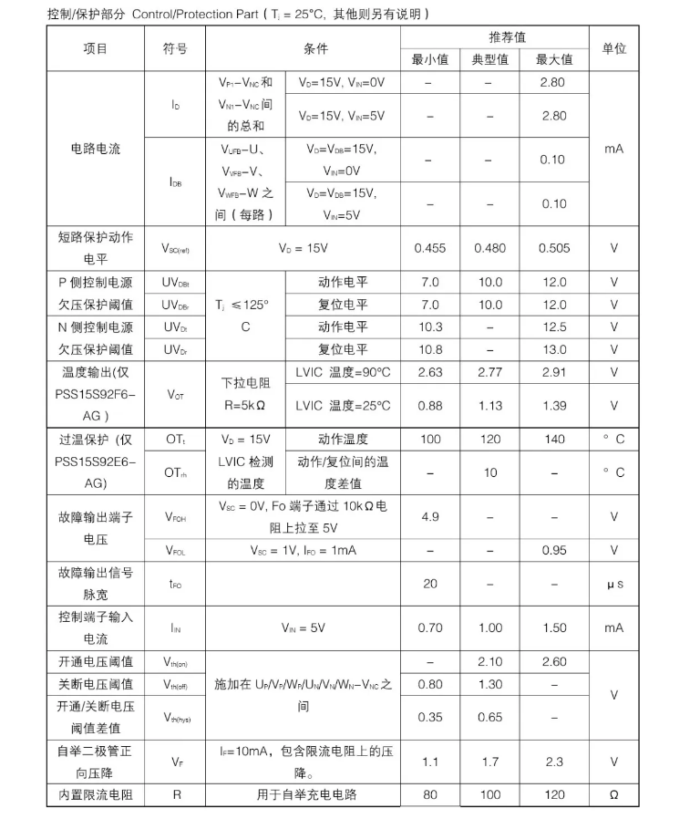 UVDBt/UVDt为P侧/N侧控制电源欠压保护动作电平,UVDBr/UVDr为P侧/N侧控制电源欠压保护复位电平。具体请参考应用手册中相关时序图,这里需要注意的是P侧控制电源发生欠压保护时是没有Fo信号产生的,模块无法正常工作且没有Fo信号产生的时候,可以先排查自举电压是否正常。
