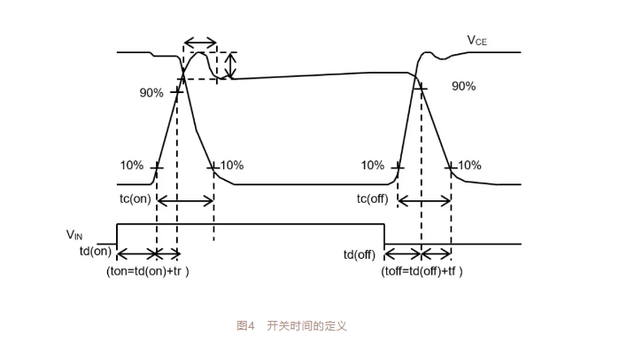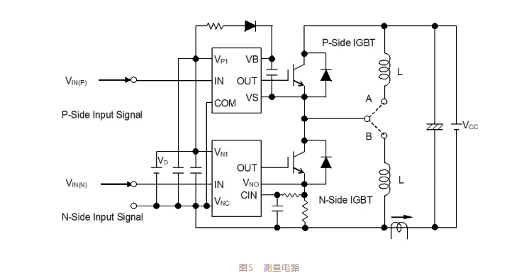 开关特性是通过对带感性负载的半桥电路进行测试而得到,开关时间(ton/ tC(on)/ toff/ tC(off)/ trr)的定义及测试方法如图4及图5所示,其中测试电路中短接A测N侧IGBT,短接B测P侧IGBT。