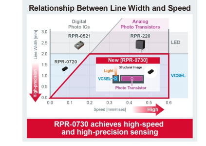 随着工业设备和办公设备向更高性能、更多功能及更智能化方向发展,对感测技术的精度提升提出了更高要求,特别是标签打印机、样本传送装置和复印机等应用,除了通过优化生产工艺等提升速度外,还需要具备能够更精准识别目标物的技术,因此引入高速且高精度的接近传感器变得至关重要。为应对这些需求,ROHM推出采用VCSEL作为发光元件、采用光电晶体管作为受光元件的模拟量接近传感器“RPR-0730”。该产品能够高速且高精度地感测传统LED光源难以识别的微细目标物。