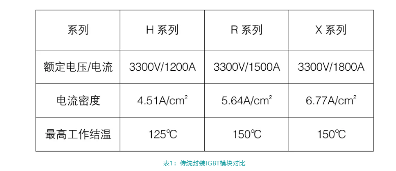 铁路牵引行业常用的传统IGBT封装如图1所示,随着Si IGBT芯片技术的不断优化,我司在H系列的基础上,陆续开发了R系列和X系列,功率密度不断提升,如表1所示。
