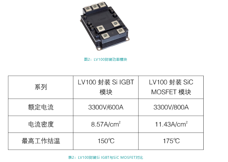 为了进一步提升功率密度,三菱电机开发了LV100封装,如图2所示。采用LV100封装的Si IGBT模块和SiC MOSFET模块如表2所示。可见,LV100封装可以提升功率密度,如果装载SiC MOSFET,其功率密度会进一步提升,并且SiC MOSFET 175℃的最高工作结温使其输出电流能力大大提升。