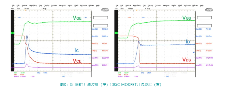 图3是我司Si IGBT模块(CM600DA-66X)和SiC MOSFET模块(FMF750DC-66A)在相同条件下(VCC=1800V, IC=600A, Tj=150°C, LS=65nH)的开通波形对比。从图中可以看出,SiC MOSFET漏源电压下降速度更快,且开通电流尖峰变小很多,这是因为SiC MOSFET模块内部采用的反并联SiC SBD是单极性器件(仅多数载流子参与导电),二极管关断时无少数载流子复合过程。
