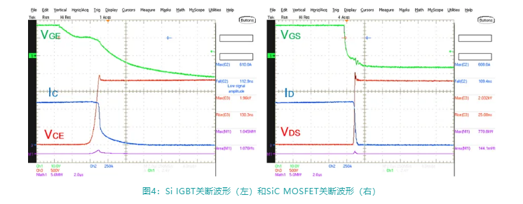 图4是我司Si IGBT模块(CM600DA-66X)和SiC MOSFET模块(FMF750DC-66A)在相同条件下(VCC=1800V, IC=600A, Tj=150°C, LS=65nH)的关断波形对比。从图中可以看出,SiC MOSFET漏源电压上升速率更快,且漏极电流关断时没有拖尾现象,同样是因为SiC MOSFET是单极性器件,关断时无少数载流子复合过程。