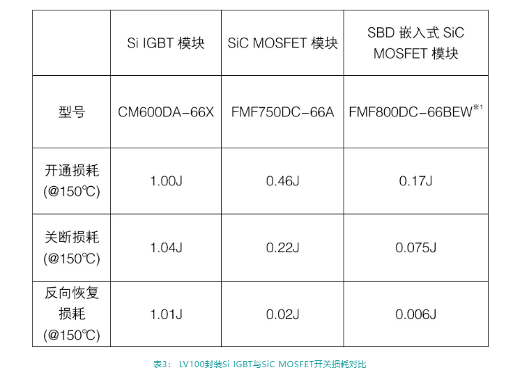 为进一步降低损耗并提升效率,我司开发了SBD嵌入式SiC MOSFET模块(FMF800DC-66BEW※1, FMF400DC-66BEW※1, FMF200DC-66BE)。如表3所示,在相同条件下(VCC=1800V, IC=600A, Tj=150°C),SBD嵌入式SiC MOSFET模块的总开关损耗相对Si IGBT模块下降91.8%,相对上一代SiC MOSFET模块下降64.3%。从而提高了牵引变流器的效率,减少电力消耗。