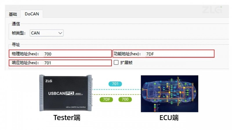 物理地址:这是CAN卡用于访问特定ECU的CAN ID。 功能地址:CAN卡通过组播请求发送消息,目标是所有具有相同“功能地址”的ECU节点。 响应地址:ECU指定用于响应某个CAN卡的CAN ID。