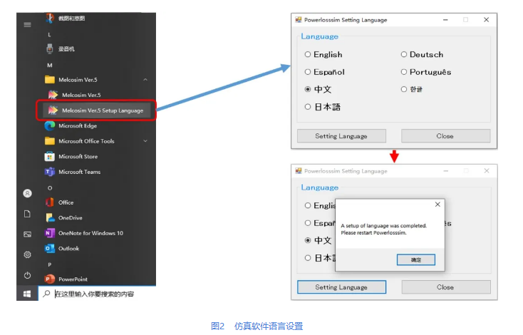 Melcosim的语言可以在系统设置,在选定需要的语言后,重启软件就可以完成设置,具体如图2所示。