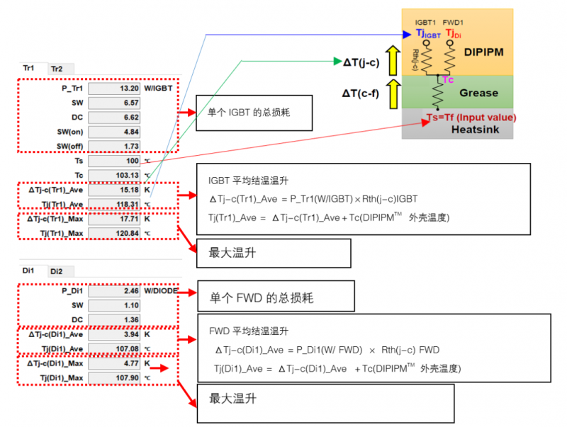 仿真结果是否满足设计要求可以通过比较仿真所得的平均结温Tj_ave以及最大Tj(max.)与具体规格书允许的数据进行比较来进行判断,一般而言推荐至少留出25°C的裕量。对于最大结温为150°C的产品,建议平均结温Tj_ave不超过125°C;对于最大结温为175°C的产品,建议平均结温Tj_ave不超过150°C,若所计算的Tj_avej大于125°C/150°C,则说明模块容量不够,应选择电流能力大一级规格的模块再重新上述计算;若Tj远小于125°C/150°C,则说明模块裕量较大,可选择电流能力小一级容量的模块再重新上述计算;若Tj小于并接近125°C/150°C,则说明模块选择得很合适。