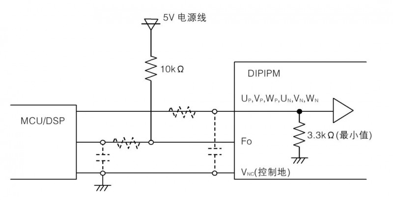 由于控制信号端子内置了3.3kΩ的下拉电阻,所以在模块外部无需再外加下拉电阻,但Fo信号线需要通过一10kΩ电阻上拉至5V。