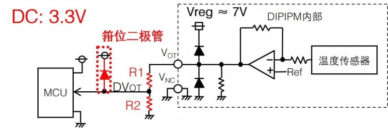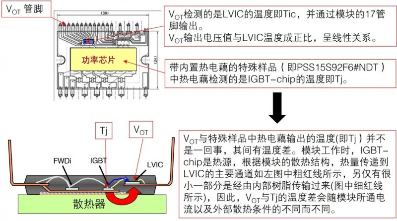 VOT功能是通过LVIC内置的温度传感器来检测LVIC上的温度,然后再将传感器信号输出至外部端子,如下图12所示IGBT和续流二极管的热量通过封装树脂和外部散热器传导到LVIC,中间传输需要时间,因此LVIC上的温度不能及时有效地反映出功率芯片温度的快速上升(例如:电机堵转、短路)。建议在诸如因散热系统受损或持续过载运行而引起的较慢温度升高时使用此功能进行保护,也可以将VOT输出的温度信号作为控制信号,在温度超过一定限值时,对压缩机进行限降频等保护时采用。