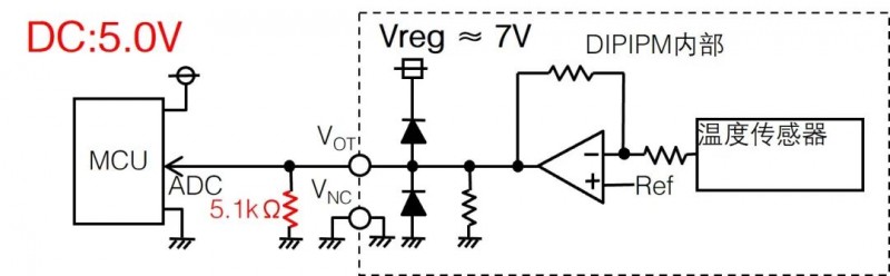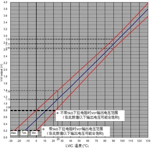 下图13是VOT接口电路图,建议加入5.1kΩ的下拉电阻以获得线性的输出特性曲线。当下拉电阻加在VOT和VNC(控制地)之间时,流过它的电流(VOT输出电压/下拉电阻值)将叠加在LVIC的电路电流上。如果将VOT仅用于检测高于室温的温度时,不需要再加入下拉电阻。