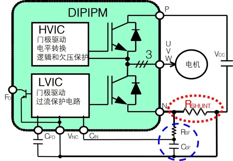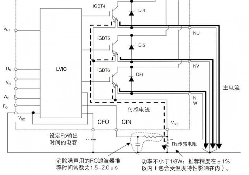 短路保护时只有下桥IGBT自动关断,当Fo结束后内部短路保护电路被复位。关于故障信号Fo的脉宽:对于SLIMDIP™和超小型DIPIPM™来说是固定的tFO=20μs(Min),对于小型DIPIPM™和大型DIPIPM™等来说是由外部的CFO来设定的(如tFO=2.4ms@CFO=22nF),具体请参考相关应用手册。DIPIPM™只能在非重复短路情况下实现保护,这要求系统MCU在检测到故障信号后切断所有PWM信号。