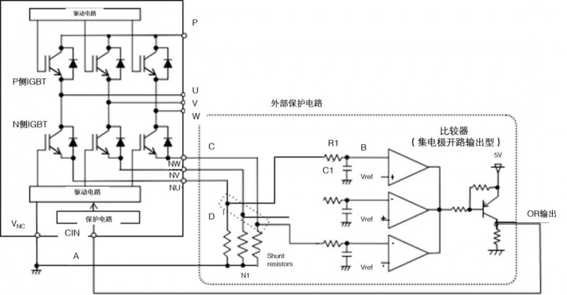 由于逆变部分控制策略及DIPIPM™种类不同,其采取的短路保护电路也不尽相同。图18是采用3旁路电阻的短路保护接口电路例,其典型特点是采用了3个旁路电阻及3个比较器;图19是采用了VSC功能作为短路保护信号的短路保护电路案例,该电路适用于配置了VSC功能的DIPIPM™,如大型DIPIPM™、大型DIPIPM+™等。图20是采用了运算放大电路的短路保护检测电路。