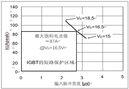 以PSS15S92*6-AG举例来说,仅当IGBT导通时间小于2.7μs时,它能够可靠关断大约5.8倍额定电流值的短路电流,如图21所示。由于短路安全工作区(SCSOA)会随控制电源电压(VD)、直流母线电压(VCC)等的不同而变化,因此,设定RC滤波器的时间常数时要考虑一定的裕量,tTOTAL=t1+t2= 2μs+0.5μs=2.5μs<2.7μs的情况下,DIPIPM™在发生短路时,可以可靠保护。