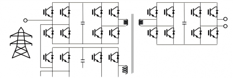 随着数据中心产业规模的逐渐增长,其供电电源高能耗的问题也日益凸显。SST(Solid-state transformers,固态变压器)采用模块化设计,具有控制灵活、无功补偿、效率高、新能源可接入等优点,是数据中心供电系统的重要发展方向。其典型拓扑如下图4所示。如果开关器件采用SiC器件,同样可以提升变换效率。同时SiC器件的高频运行特性可以减小变压器体积,提高系统功率密度。