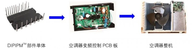 在3.3,3.4的讲座中,我们主要介绍了如何为DIPIPM™设计驱动电路及PCB控制板。DIPIPM™作为一种功率器件,需要与外围的电源电路、驱动保护电路、采样电路等一起相互配合才能完成相应的逆变功能。实际产品中承担这种逆变功能的是变频控制PCB板。变频控制PCB板被装配到了整机上,再与其他的结构部件及系统部件组合成整机。DIPIPM™的功能是否能够良好发挥与PCB及整机的设计是分不开的。图1是以变频空调为例的DIPIPM™由部件到产品的基本生产流程。