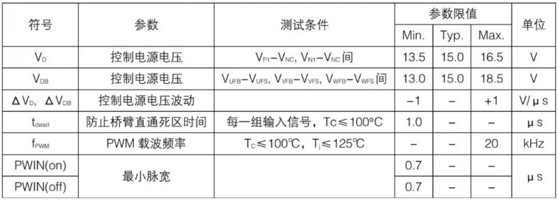 DIPIPM™工作时其电源通常为15V,由于采用了自举电路,其上桥臂的三路15V电源可以通过自举电路来实现。电源的稳定性对于DIPIPM™的稳定运行至关重要。因此需要对PCB上15V电源的稳定性进行评价。除了需要稳定的15V电源外,PCB还要为DIPIPM™提供稳定的PWM驱动信号,PWM驱动信号的质量也会直接影响DIPIPM™的工作,PWM驱动信号的评价也是评价的重点之一。下表1是以SLIMDIP-L为例的DIPIPM™有关15V电源和PWM控制信号的规格要求。在实际PCB上SLIMDIP-L的电源和PWM驱动信号应满足表1的规格要求。