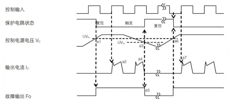 欠压保护是用来防止在低电源电压下DIPIPM™发生意外损坏的一种自保护功能。P侧和N侧都有欠压保护功能,但是故障信号(Fo)仅对N侧的欠压保护才有输出,且在欠压状态下会持续有Fo输出。另外,欠压保护电路内置了一个噪声滤波器(典型值10μs)以防止瞬间欠压导致的误触发。因此,在发生欠压后的最初10μs内控制信号依然有效。下图5是以SLIMDIP-L为例的DIPIPM™欠压保护时序图。下表4是欠压保护评价方法及标准。