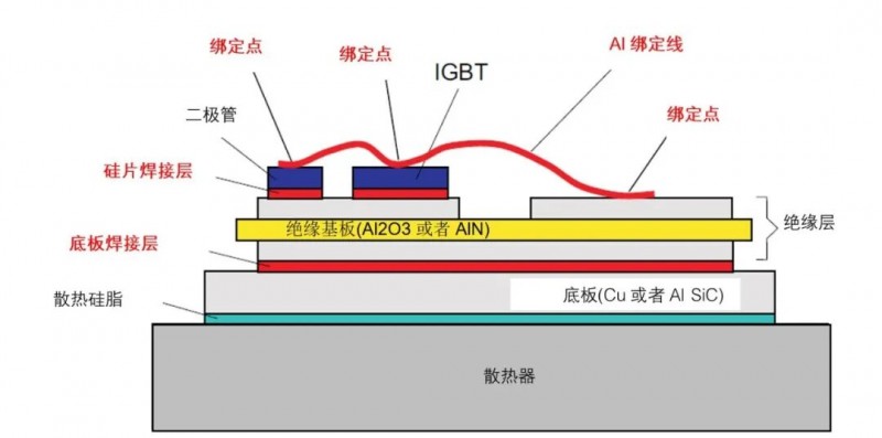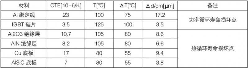 图1为普通半导体模块的剖面构造图。其中红色标注的部分为影响模块寿命的连接点。结合表1中的各种材料热膨胀系数。我们可以发现无论是功率循环寿命还是热循环寿命,损坏点上下两层材料的热膨胀系数都是相差非常大的。