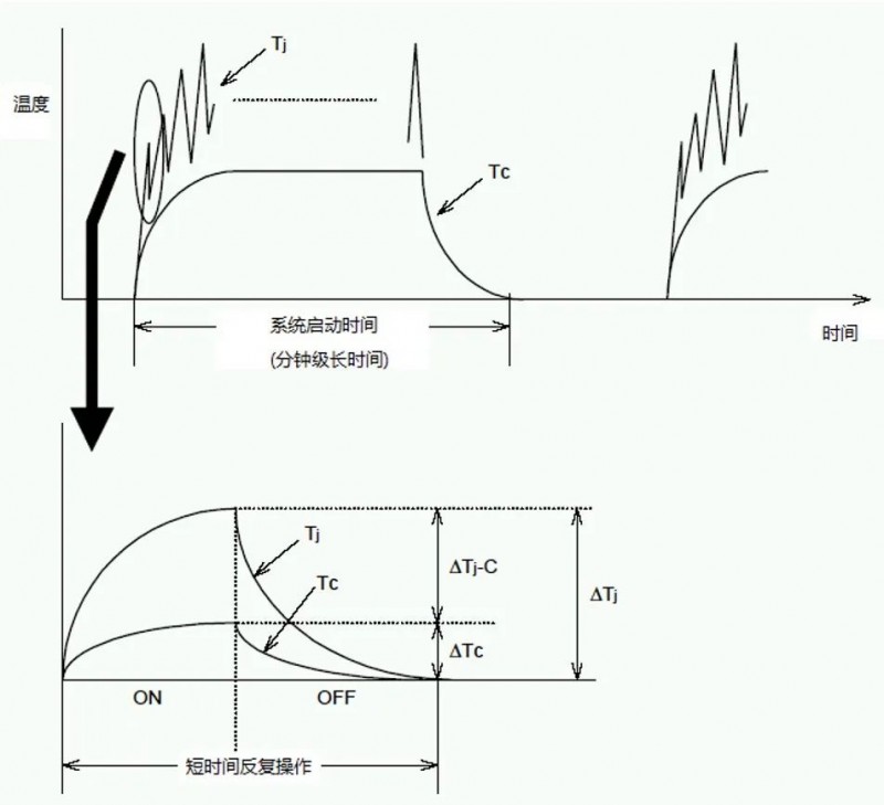 1.壳温(Tc)变化很小,但结温(Tj)变化频繁。此工作模式下的寿命称为功率循环寿命,对应的损坏称为功率循环寿命损坏,它对应的是结温的变化(ΔTj)。