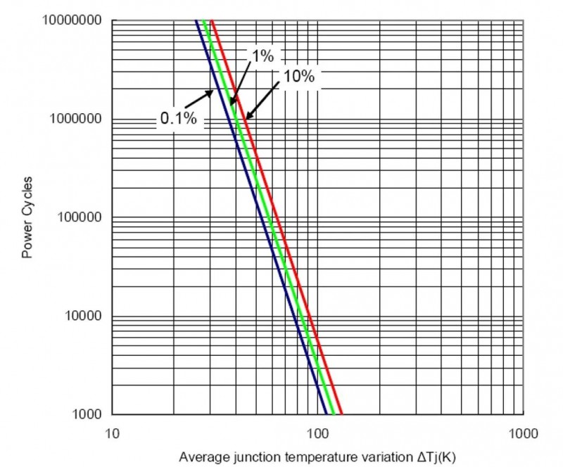 这条寿命曲线是基于Tjmax=125℃、故障率1%的测试条件,将ΔTj=46/88/98℃下的测试数据连线并延长后得到的衰减曲线。0.1%和10%的曲线是通过韦伯分布(Weibull distribution)计算出来的。