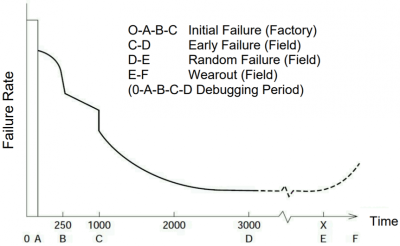 简单来说,随着运行时间的增长,器件的损坏越来越多。这既符合我们的生活常识,也很符合描述半导体损坏率的浴缸曲线。如图6 E-F段所示。