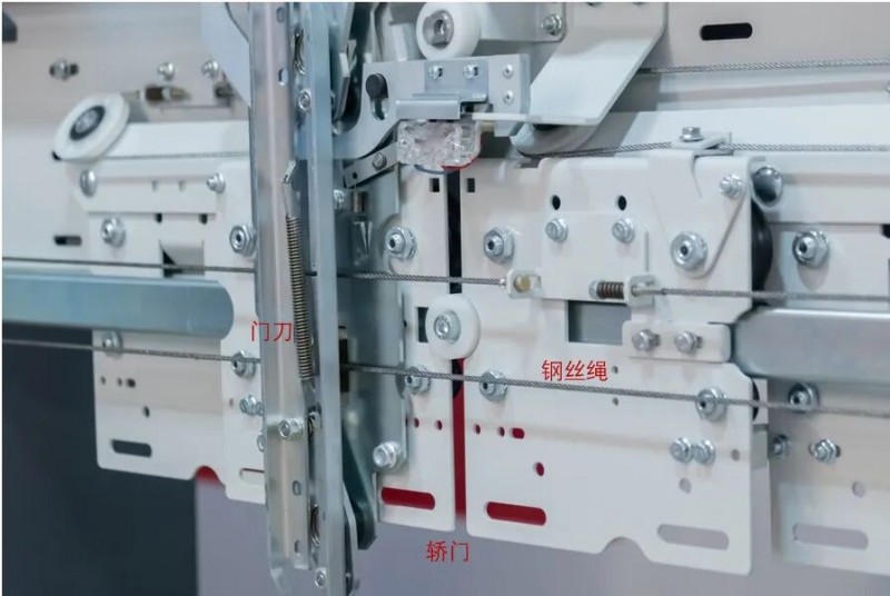先解释一下,电梯门的结构。一般说的电梯门其实是分为两道门,厅门和轿门。其中厅门没有动力,开门的动力来自轿门上门机变频器。门机变频器控制电机,再通过钢丝绳连接到轿门和门刀上。而厅门则由门刀传递动力进行开门。图8是电梯门机的局部图。图中可以看到钢丝绳,门刀和轿门。