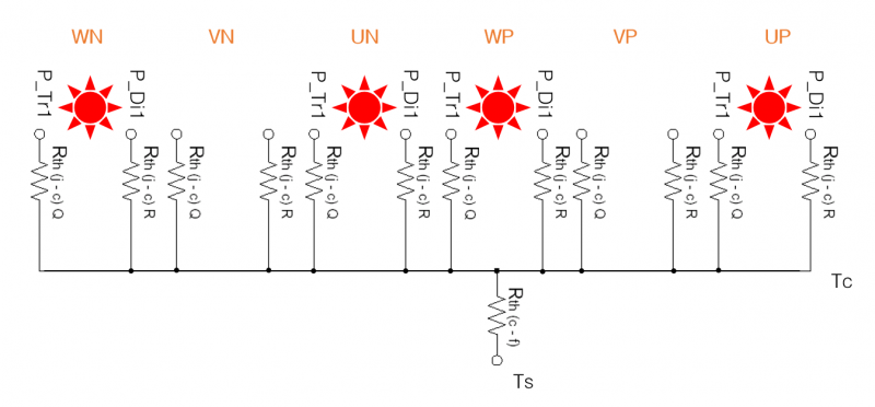 图2所示为DIPIPM™在H桥应用中的结温计算模型。我们以PSS50S73F6为例演示一下其在H桥应用中的功耗仿真。