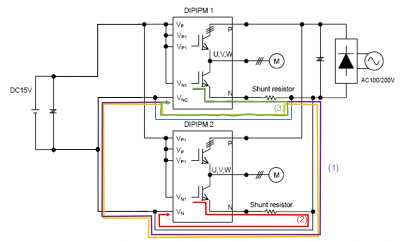 在三菱电机的应用手册中,实际上并不推荐两片DIPIPM™共用一组15V电源。如上图所示,电流路径1会经过较长的PCB走线,从而导致更多的噪音和误动作。