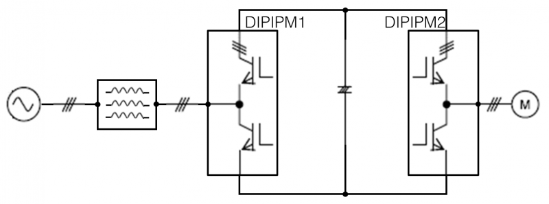 对于DIPIPM™来说,由于规格比较小,类似的应用场景并不多,比较典型的是商用空调。其中DIPIPM1作为PWM整流器使用,而DIPIPM2作为逆变器驱动空调压缩机。
