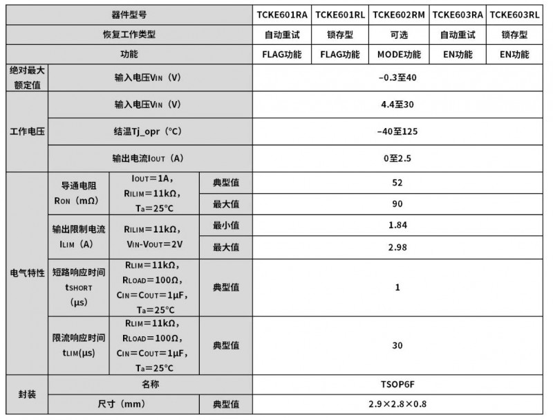 TCKE6系列产品的额定电压为40V,支持4.4V至30V的宽输入电压范围,使其适用于5V、9V、12V和24V系统等电源管理应用。52mΩ(典型值)的低导通电阻降低了运行时的功耗,有助于提高效率。TSOP6F小型封装(2.9mm×2.8mm(典型值)),有助于减小电路板尺寸。这些eFuse IC适用于包括工业设备和消费类设备在内的广泛应用。