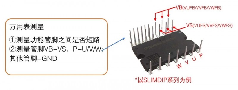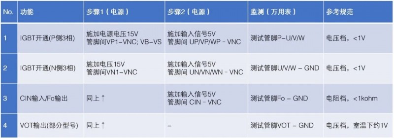 上述测量方法旨在通过给DIPIPM™施加相应的电源和控制信号,采用万用表检测模块输出是否正常,来判断模块是否损坏。这种基本的功能测试使用的是常用的检测设备,方便快捷。