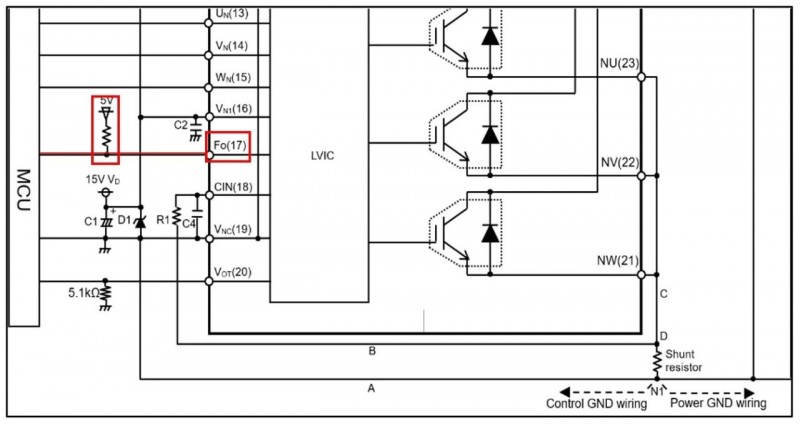步骤二:在用万用表初步测试正常后,可以对DIPIPM™及PCB控制板上电,对工作波形进行测试。DIPIPM™具有Fo(故障信号)输出功能,其目的是在DIPIPM™检测到诸如控制电源欠压、过流、过温时自动切断下桥臂IGBT,并在模块Fo端口输出低电平信号来通知MCU关闭PWM信号以保护DIPIPM™模块。DIPIPM™ Fo端口电路结构如下图2所示。
