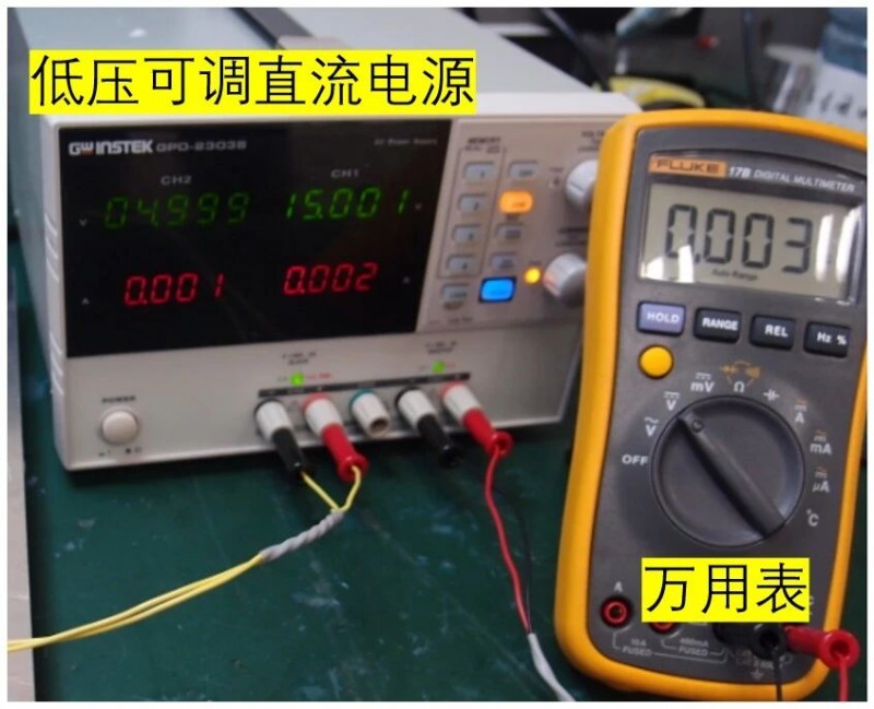 以上的方式已经能够对大部分失效品做基础的判定了,某些特殊情况下,例如静电导致的微小损坏,需要进行额外的功能测试来对DIPIPM™的好坏进行判定。这个时候我们还需要一个直流电源,通常大家都有低压可调的直流电源,如下图8所示。