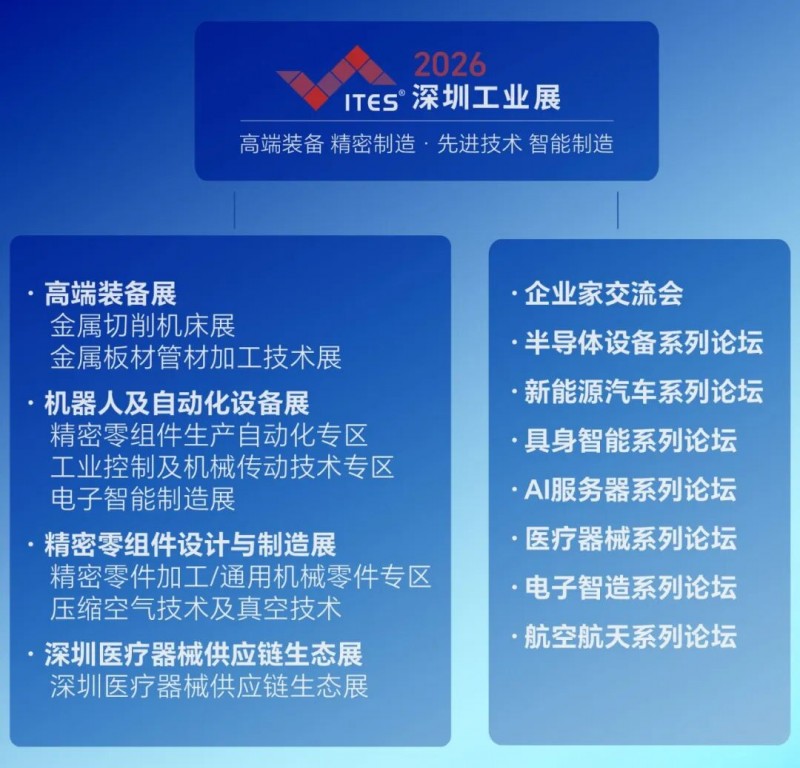 在万亿级赛道爆发的当下,精密制造能力与可靠供应链已成为企业核心竞争力。ITES 深圳工业展以高端装备、机器人及自动化、精密零组件三大主题展为核心,汇聚国内外顶尖装备技术品牌及原厂,以高端装备、机器人及自动化、精密零组件三大主题为核心展览内容,构建从工业母机、精密加工到自动化、智能化、柔性化系统解决方案的完整产业闭环。