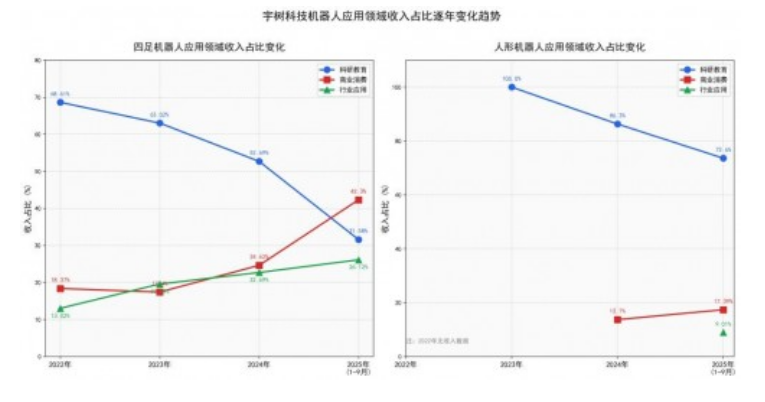 宇树科技“关于宇树科技股份有限公司首次公开发行股票并在科创板上市预先审阅申请文件的问询函的回复”显示,以四足机器人为例,其中科研教育的收入占比从2022年的68.61%,降低到2025年1—9月的31.58%。到2025年1—9月,商业消费、行业应用收入占比分别提升到42.30%、26.12%,商业消费已超过科研教育,成为公司四足机器人销售占比最大的应用领域。