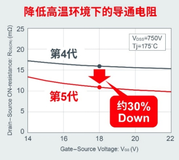 ROHM在开发第5代SiC MOSFET的过程中,通过改进器件结构并优化制造工艺,与以往的第4代产品相比,成功地将功率电子电路实际使用环境中备受重视的高温工作时(Tj=175℃)的导通电阻降低约30%(相同耐压、相同芯片尺寸条件下比较)。在xEV用牵引逆变器等需要在高温环境下使用的应用中,该产品有助于缩小单元体积,提高输出功率。